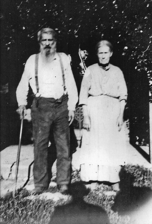 | Louis Joseph Barron (1831 - 1922) and his wife, Rosalie Lesaire (1838 - 1925). Both were born in Ontario, Canada. Both chewed tobacco and both were renowned spitters. Note the stain on his beard. French was their native language; their English came with a strong accent. |