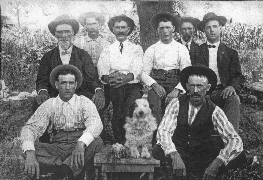 Left to right. Front row: Joshua Walker, dog, Charlie Dawkins. Middle row: John Walker, Albert "Bude" Walker, unknown, John William "Big Bill" Walker. Back row: unidentified.