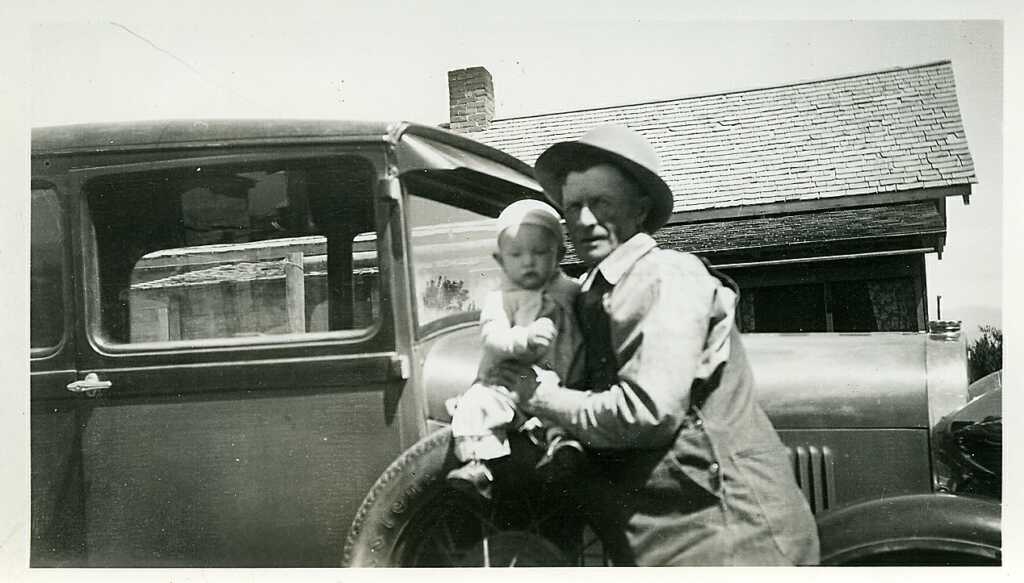Ira G. Frazier with little Jerry W. Hoover. The car belonged to Lon Stockwell.