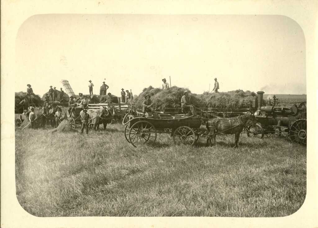 Lon and Aza Stockwell are included in this work group. Note the steam engine at far right.