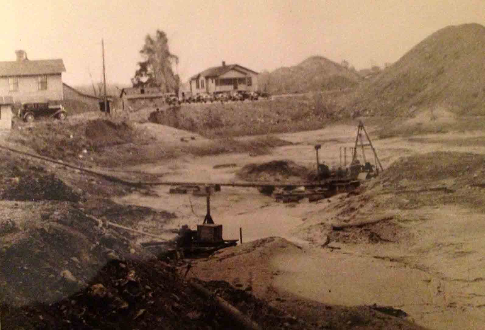Digging of the lake bed behind the house and the office of the Cooley Gravel Company east of Sampsel. The photo was taken in the 1930s.