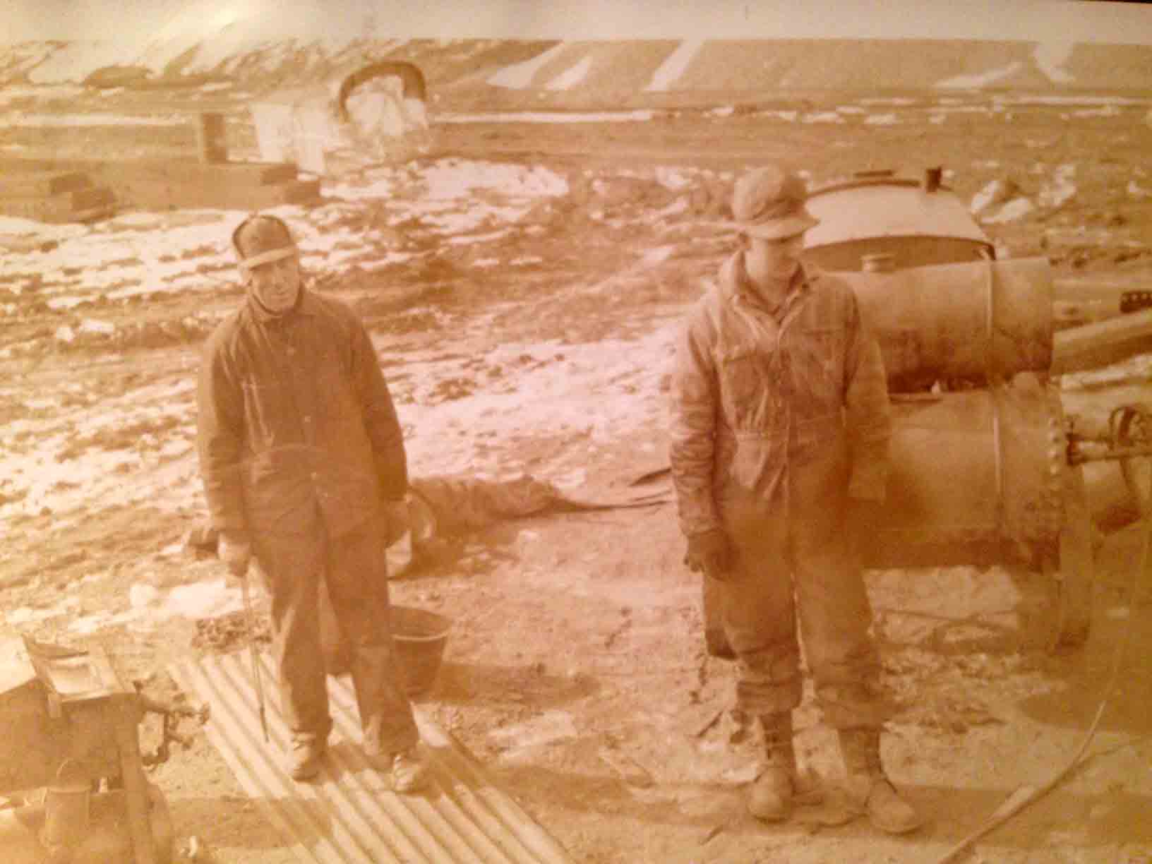 The man on the right is thought to be Ira Wybrow. He was married to Willa Hazel Trammell. The man on the left is unidentified. The photo was taken at Cooley's gravel pit in the 1930s.